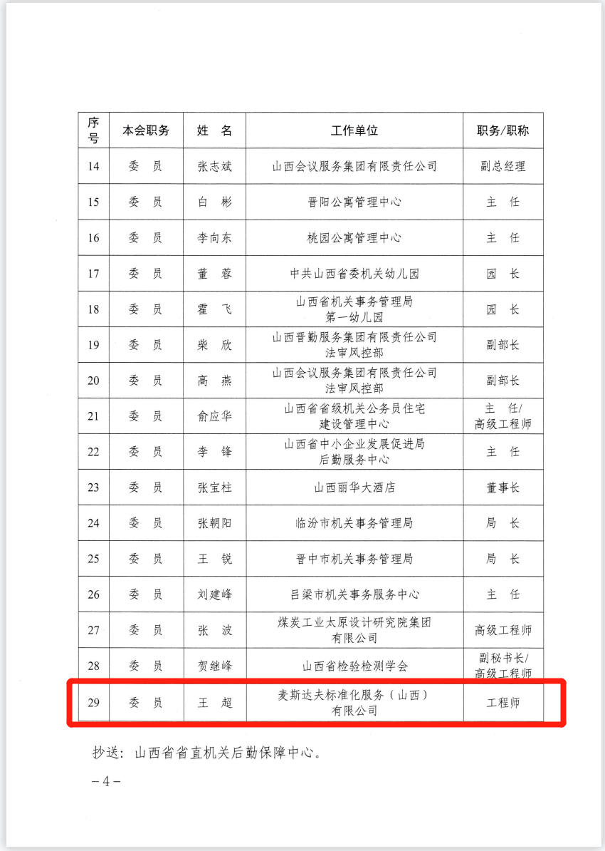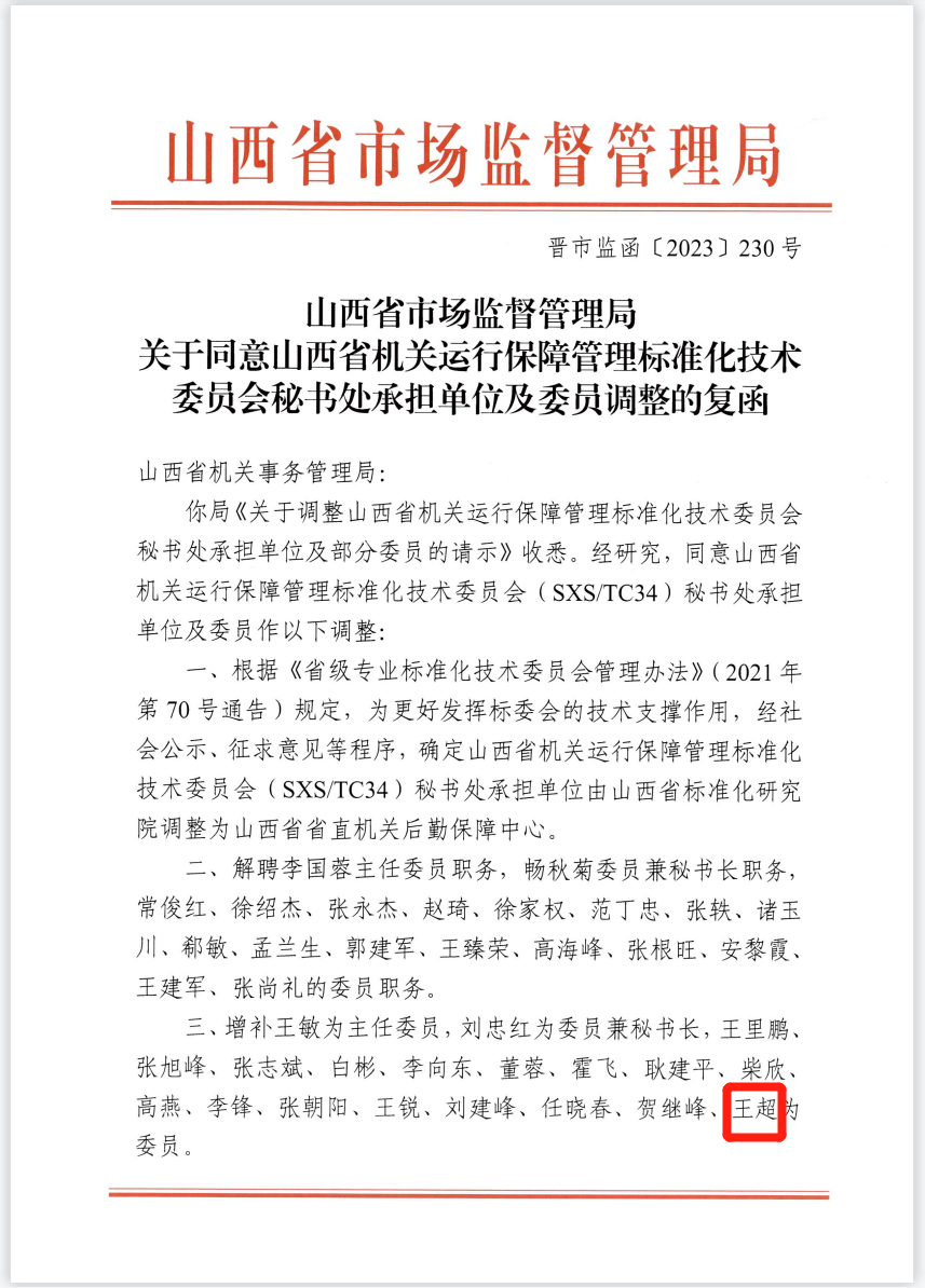 王超當(dāng)選山西省機(jī)關(guān)運(yùn)行保障管理標(biāo)準(zhǔn)化技術(shù)委員會(huì)委員