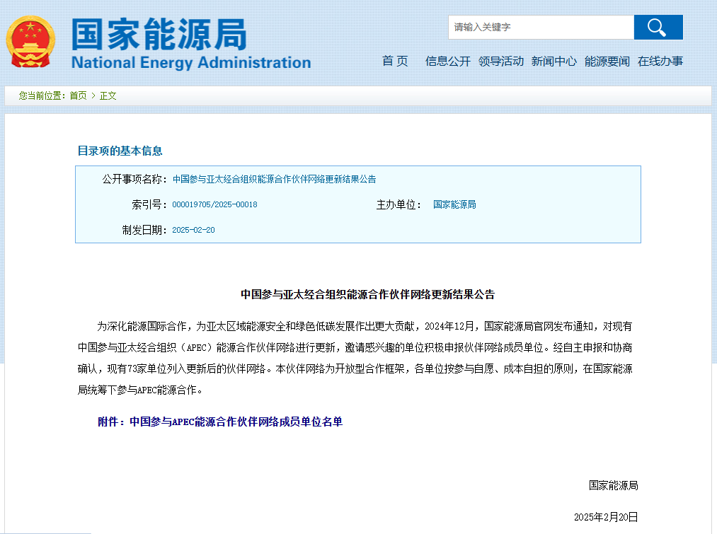 為深化能源國(guó)際合作,為亞太區(qū)域能源安全和綠色低碳發(fā)展作出更大貢獻(xiàn),2024年12月,國(guó)家能源局官網(wǎng)發(fā)布通知,對(duì)現(xiàn)有中國(guó)參與亞太經(jīng)合組織(APEC)能源合作伙伴網(wǎng)絡(luò)進(jìn)行更新,邀請(qǐng)感興趣的單位積極申報(bào)伙伴網(wǎng)絡(luò)成員單位。經(jīng)自主申報(bào)和協(xié)商確認(rèn),現(xiàn)有73家單位列入更新后的伙伴網(wǎng)絡(luò)。本伙伴網(wǎng)絡(luò)為開(kāi)放型合作框架,各單位按參與自愿、成本自擔(dān)的原則,在國(guó)家能源局統(tǒng)籌下參與APEC能源合作。