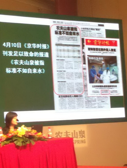 4月12日,《京華時報》撰文稱飲用水協(xié)會確認農(nóng)夫山泉標準不及自來水。任何瓶裝水企業(yè)都必須以國家強制性標準《生活飲用水標準》為底線,若不能執(zhí)行則有違反國家食品安全法之嫌。