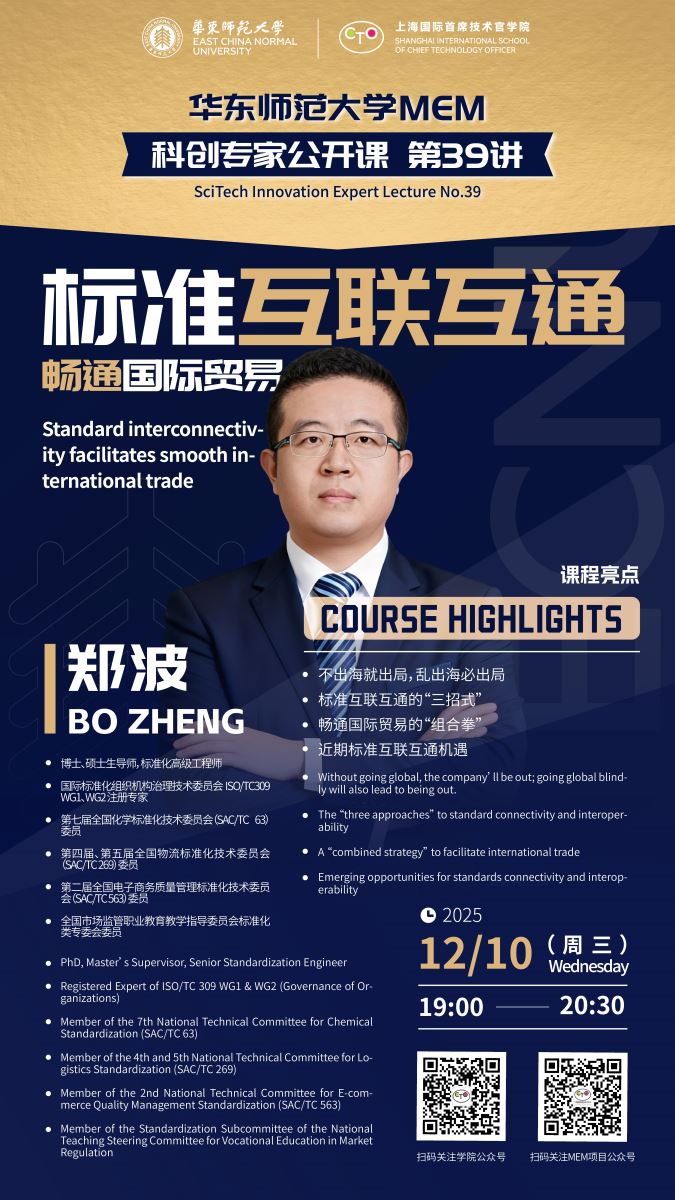 2025年12月10日,華東師范大學(xué)(上海國(guó)際首席技術(shù)官學(xué)院)成功舉辦科創(chuàng)專家公開(kāi)課第39講。本次課程特邀麥斯達(dá)夫集團(tuán)創(chuàng)始人、首席執(zhí)行官鄭波,以《標(biāo)準(zhǔn)互聯(lián)互通 暢通國(guó)際貿(mào)易》為題,為MEM(工程管理碩士)新生及與會(huì)師生帶來(lái)一場(chǎng)緊扣時(shí)代脈搏的專題講座。
