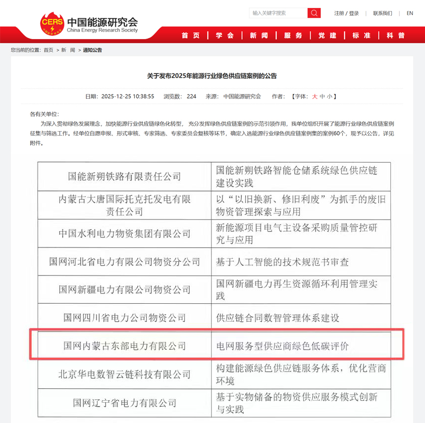 2025年12月25日,由中國(guó)能源研究會(huì)綠色供應(yīng)鏈專(zhuān)業(yè)委員會(huì)、綠色供應(yīng)鏈認(rèn)證工作委員會(huì)組織的2025年能源行業(yè)綠色供應(yīng)鏈案例名單公布。由國(guó)網(wǎng)內(nèi)蒙古東部電力有限公司申報(bào),北京麥斯達(dá)夫科技集團(tuán)股份有限公司作為技術(shù)支撐機(jī)構(gòu)的“電網(wǎng)服務(wù)型供應(yīng)商綠色低碳評(píng)價(jià)”案例,憑借其創(chuàng)新性、示范性和顯著成效,成功入選案例名單。