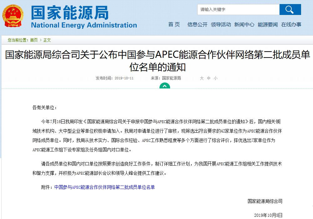 2019年7月16日,國家能源局印發(fā)《國家能源局綜合司關(guān)于申報(bào)中國參與APEC能源合作伙伴網(wǎng)絡(luò)第二批成員單位的通知》后,國內(nèi)相關(guān)領(lǐng)域技術(shù)機(jī)構(gòu)、大中型企業(yè)等單位積極申請(qǐng)加入。國家能源局對(duì)申請(qǐng)單位進(jìn)行了審核,現(xiàn)篩選出符合要求的42家單位作為APEC能源合作伙伴網(wǎng)絡(luò)成員單位。同時(shí),國家能源局從技術(shù)實(shí)力、國際合作經(jīng)驗(yàn)、APEC工作熟悉程度等多個(gè)方面進(jìn)行了綜合評(píng)價(jià),擇優(yōu)選出7家單位作為APEC能源工作組下設(shè)專家組及任務(wù)組國內(nèi)對(duì)口單位。