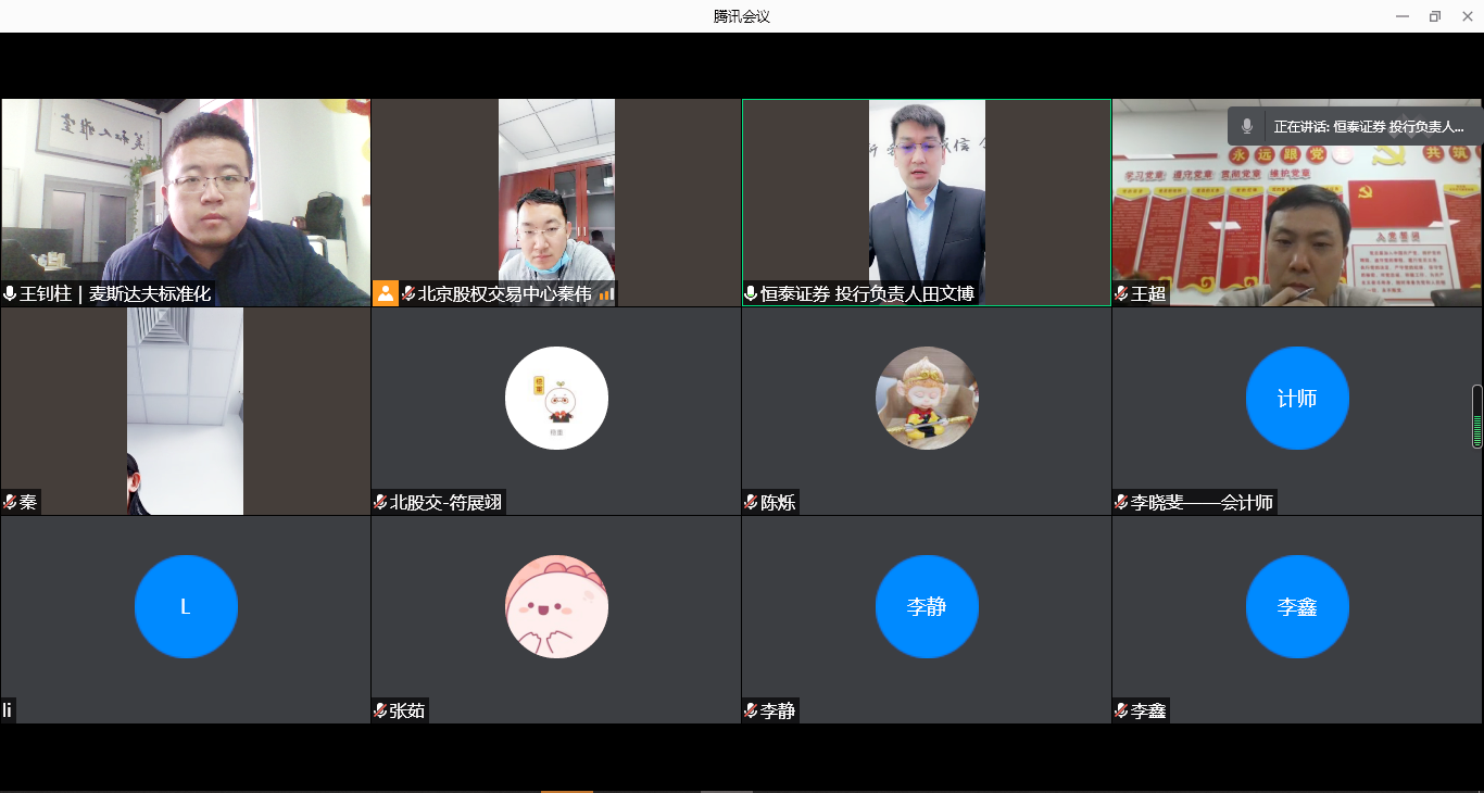 2021年1月19日,全國中小企業(yè)股份轉讓系統(tǒng)掛牌第一次輔導會以視頻會議形式召開。北京股權交易中心投資者與產品部負責人符展翊,恒泰長財證券、海潤天睿律師事務所、中興財光華會計事務所相關負責人員出席會議。麥斯達夫首席執(zhí)行官鄭波、首席運營官王超、市場總監(jiān)王釗柱參加會議。會議由北京股權交易中心投資者與產品部高級經(jīng)理秦偉主持。