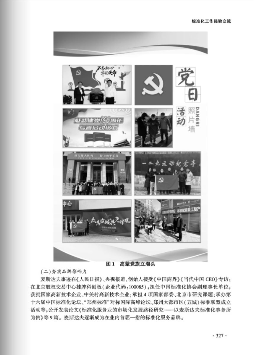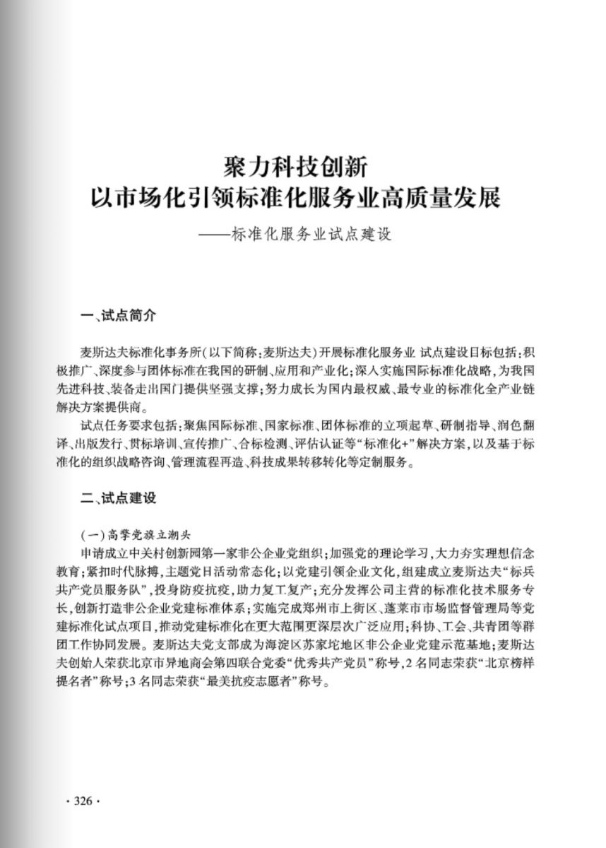 “聚力科技創(chuàng)新 以市場(chǎng)化引領(lǐng)標(biāo)準(zhǔn)化服務(wù)業(yè)高質(zhì)量發(fā)展”以麥斯達(dá)夫高分通過(guò)標(biāo)準(zhǔn)化服務(wù)業(yè)試點(diǎn)驗(yàn)收為基礎(chǔ),由試點(diǎn)簡(jiǎn)介、試點(diǎn)建設(shè)、試點(diǎn)成效、承擔(dān)單位簡(jiǎn)介四部分內(nèi)容組成。全文以圖文并茂的形式充分展示了麥斯達(dá)夫標(biāo)準(zhǔn)化服務(wù)業(yè)試點(diǎn)經(jīng)驗(yàn)和公司發(fā)展路徑以及試點(diǎn)期間取得的顯著經(jīng)濟(jì)、社會(huì)效益等內(nèi)容,標(biāo)志著麥斯達(dá)夫標(biāo)準(zhǔn)化事務(wù)所已經(jīng)在標(biāo)準(zhǔn)化服務(wù)業(yè)中成為佼佼者,也必然引領(lǐng)北京市乃至全國(guó)標(biāo)準(zhǔn)化服務(wù)業(yè)的發(fā)展。