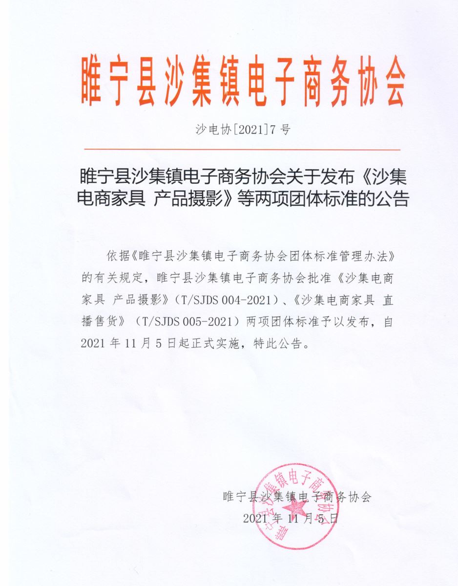 2021年11月5日,由麥斯達(dá)夫主導(dǎo)編制的《沙集電商家具 產(chǎn)品攝影》(T/SJDS 004-2021)、《沙集電商家具 直播售貨》(T/SJDS 005-2021)兩項(xiàng)團(tuán)體標(biāo)準(zhǔn)正式獲批發(fā)布。