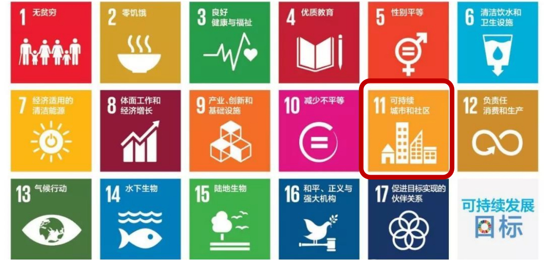 •  2016年1月1日,2030年可持續(xù)議程在全球正式啟動(dòng),發(fā)布了17項(xiàng)可持續(xù)發(fā)展目標(biāo),其中第11項(xiàng):可持續(xù)城市和社區(qū)。