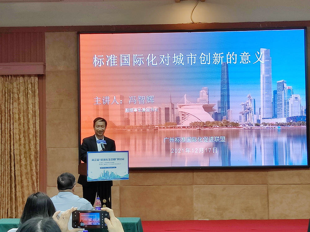 主題演講環(huán)節(jié),首先由廣州市標準化研究院副院長馮智輝作《標準國際化對城市創(chuàng)新的意義》的主題報告。