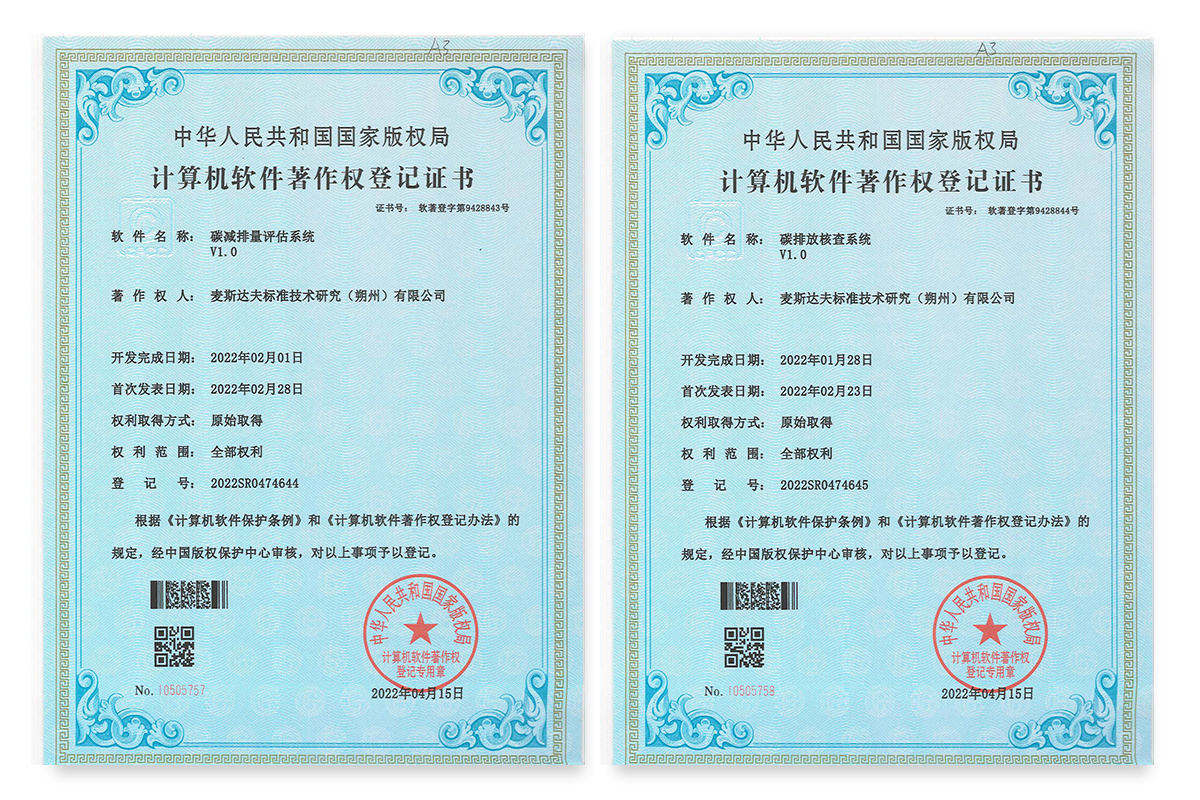 2022年5月16日,麥斯達(dá)夫標(biāo)準(zhǔn)技術(shù)研究 (朔州)有限公司獲得兩項軟件著作權(quán)證書,“碳減排量評估系統(tǒng)V1.0”“碳排放核查系統(tǒng)V1.0”。