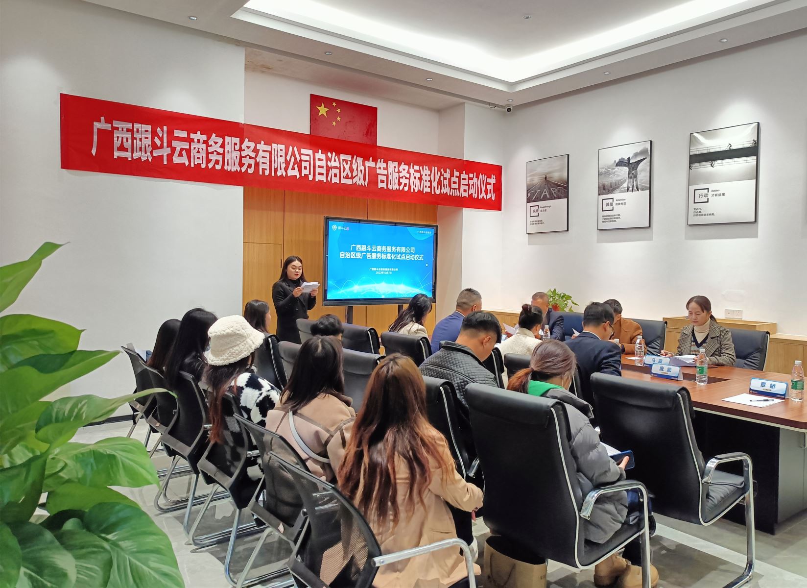 2022年12月7日,廣西壯族自治區(qū)級標準化試點項目——廣西跟斗云商務(wù)服務(wù)有限公司廣告服務(wù)標準化試點啟動儀式在廣西跟斗云商務(wù)服務(wù)有限公司會議室召開。南寧市市場監(jiān)督管理局四級調(diào)研員臧偉洲、標準化科科長馬霞,青秀區(qū)市場監(jiān)督管理局副局長劉成偉,廣西跟斗云商務(wù)服務(wù)有限公司總經(jīng)理遲玉成,跟斗云集團事業(yè)二部負責人黃婭婕,工廠運營總監(jiān)廖煒瑩等人出席會議。跟斗云集團其他有關(guān)部門及門店負責人參加會議。會議由廣西跟斗云商務(wù)服務(wù)有限公司人事主管覃嬌主持。
