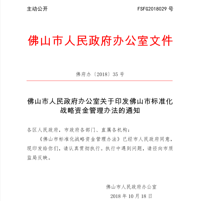 佛山市人民政府辦公室關(guān)于印發(fā)佛山市標(biāo)準(zhǔn)化戰(zhàn)略資金管理辦法的通知