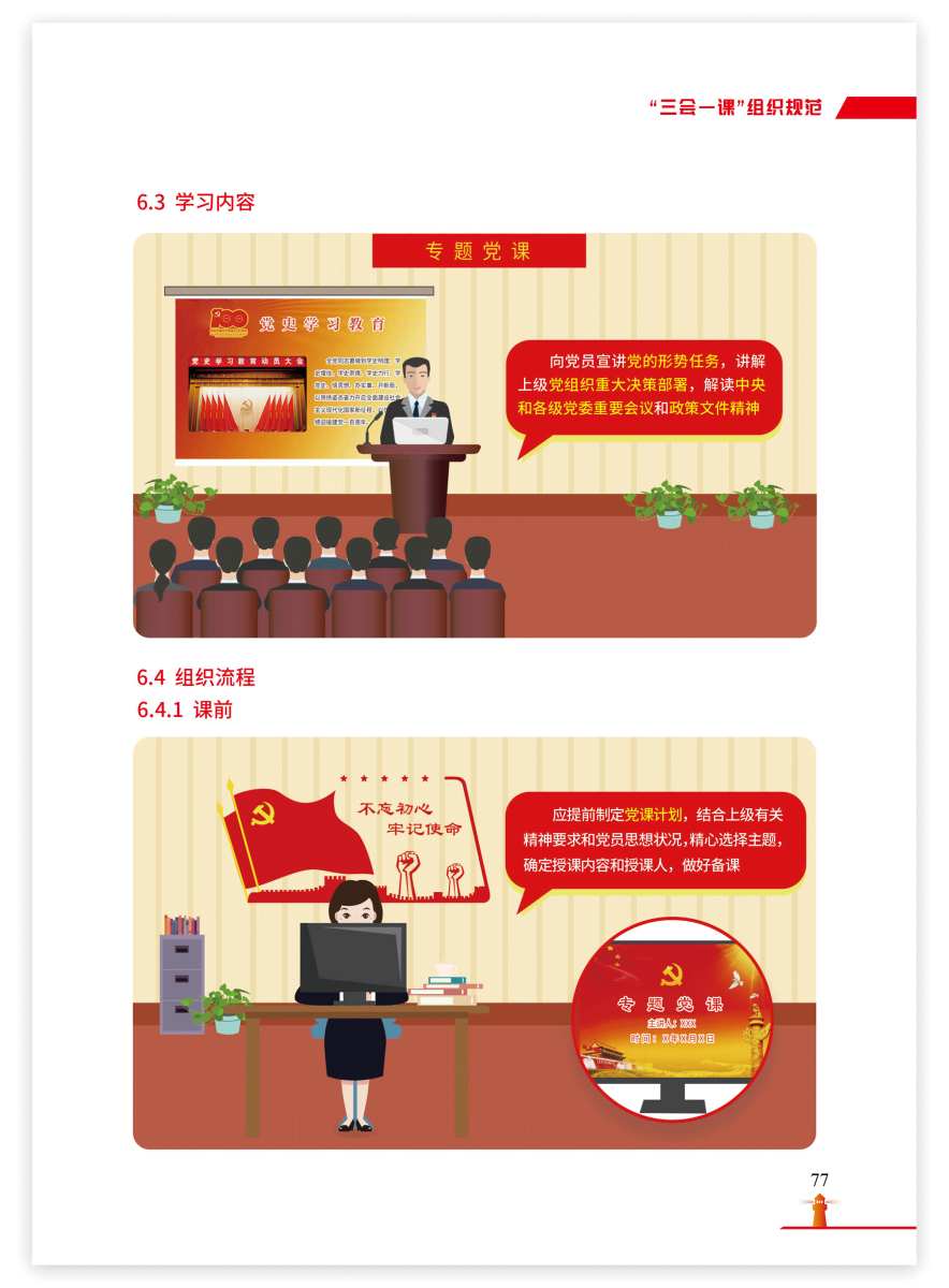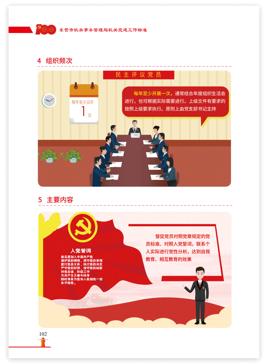 《東營市機關事務管理局機關黨建工作標準》(圖解版)系統(tǒng)梳理了機關黨建工作的規(guī)章制度,把機關黨建工作的內容、要求、流程都以標準的形式固定下來。全書涵蓋了黨組理論學習中心組學習、黨組織書記抓基層黨建述職評議考核、機關黨建換屆選舉、黨員發(fā)展、“三會一課”、主題黨日活動、組織生活會、民主評議黨員、“身邊的榜樣”選樹等九個方面的工作,既包含了機關黨建的規(guī)定動作,也在黨建工作與業(yè)務工作融合上進行了初步探索,供黨建工作者學習參考。全書以“標準圖解版”的形式呈現(xiàn),一共繪制了242張圖片,每一個場景、每一個細小元素均經過精心設計。