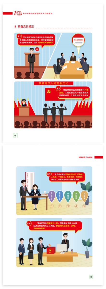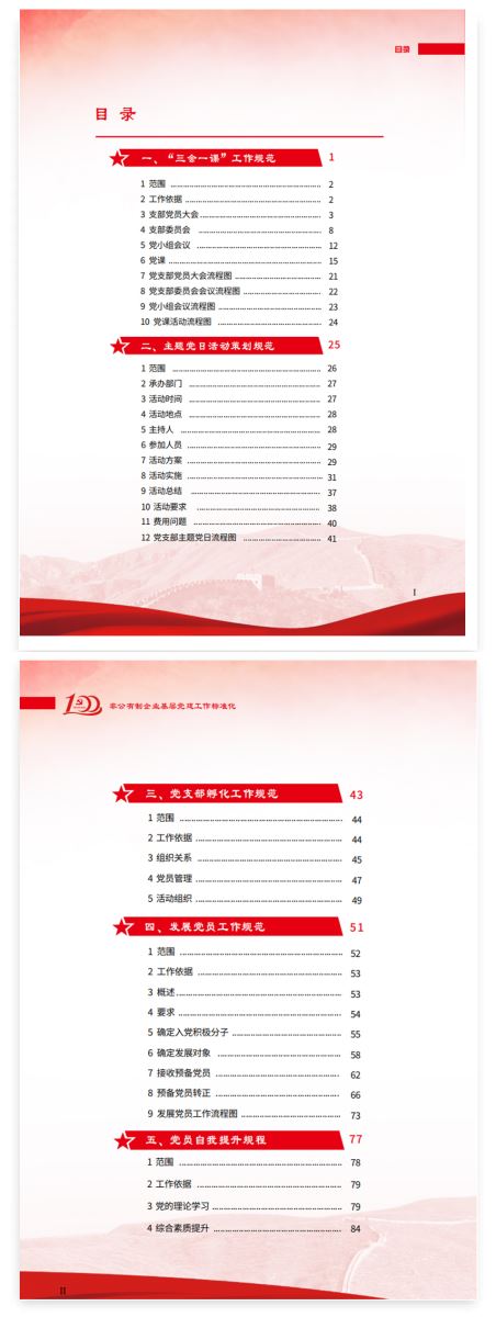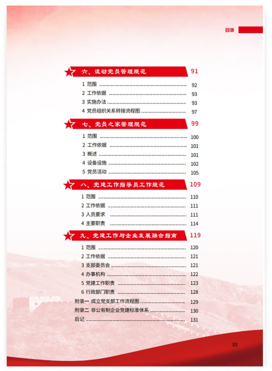 本書主體章節(jié)由九個(gè)標(biāo)準(zhǔn)圖解版組成,分別是“第一章‘三會(huì)一課’工作規(guī)范”“第二章 主題黨日活動(dòng)策劃規(guī)范”“第三章 黨支部孵化工作規(guī)范”“第四章 發(fā)展黨員工作規(guī)范”“第五章 黨員自我提升規(guī)程”“第六章 流動(dòng)黨員管理規(guī)范”“第七章 黨員之家管理規(guī)范”“第八章 黨建指導(dǎo)員工作規(guī)范”“第九章 黨建工作與企業(yè)發(fā)展融合指南”。這九個(gè)標(biāo)準(zhǔn)是從麥斯達(dá)夫標(biāo)準(zhǔn)化事務(wù)所自主研發(fā)的“非公企業(yè)黨建工作標(biāo)準(zhǔn)體系”中篩選出的精中之精,凸顯非公特色、使用頻率較高、便于推廣應(yīng)用,為非公有制企業(yè)開展黨建工作提供了可借鑒、可復(fù)制、可操作的做法和經(jīng)驗(yàn)。