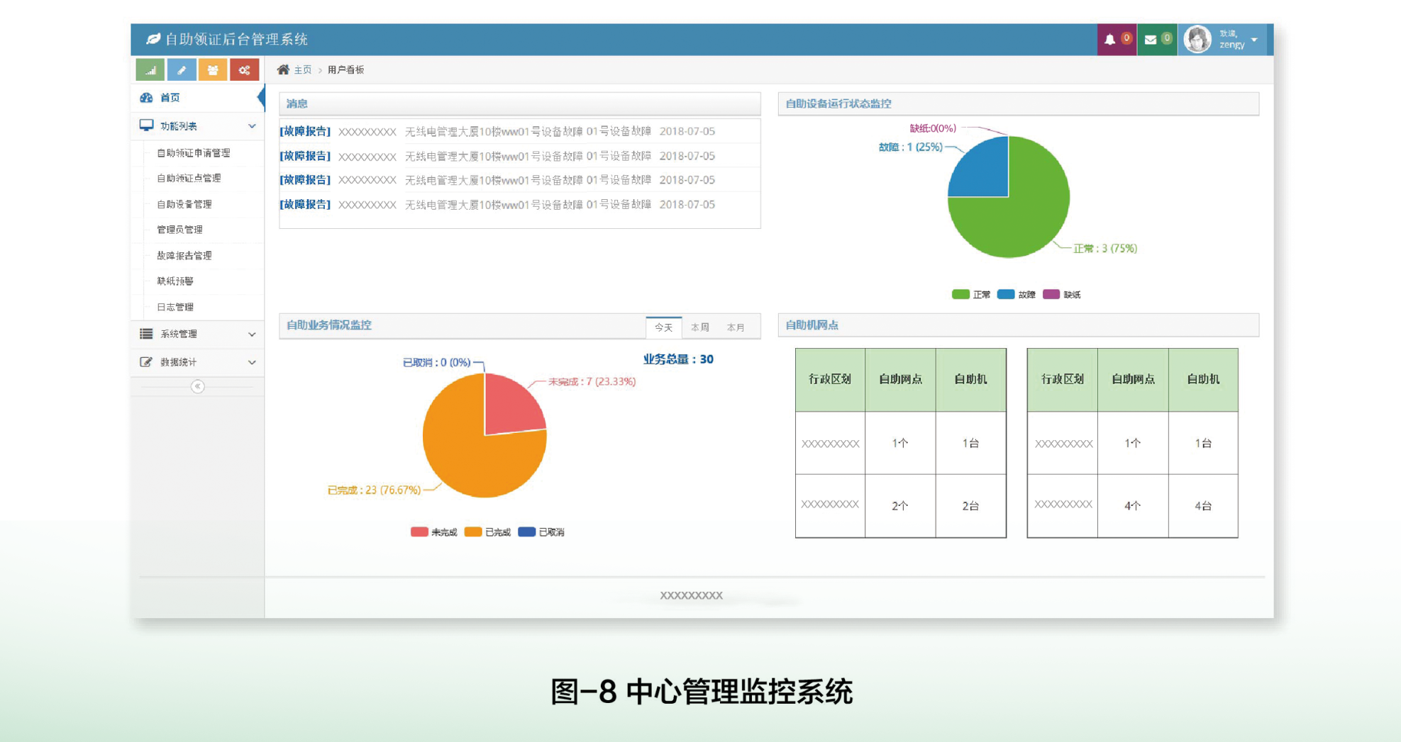 管理和監(jiān)控系統(tǒng)提供給運(yùn)營(yíng)人員使用,通過(guò)該系統(tǒng)對(duì)分布在各個(gè)政務(wù)大廳的自助打印機(jī)進(jìn)行統(tǒng)一管理和監(jiān)控。系統(tǒng)及時(shí)處理自助領(lǐng)照申請(qǐng),監(jiān)控各政務(wù)大廳自助機(jī)運(yùn)行狀態(tài),處理自助機(jī)故障處理請(qǐng)求,并對(duì)各打印機(jī)出證量、剩余空白證照做實(shí)時(shí)統(tǒng)計(jì)和預(yù)警,為自助打印機(jī)的正常運(yùn)行提供保障與支持。