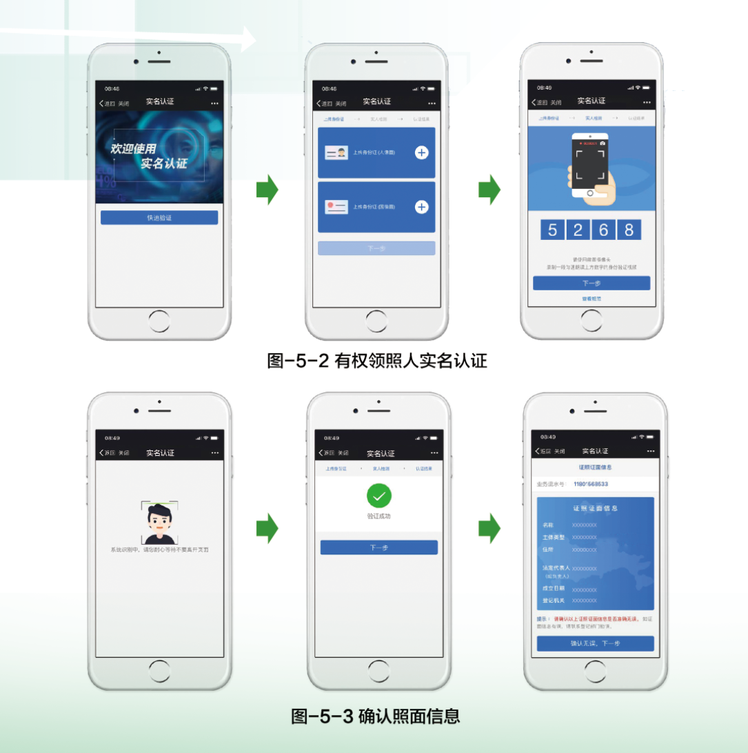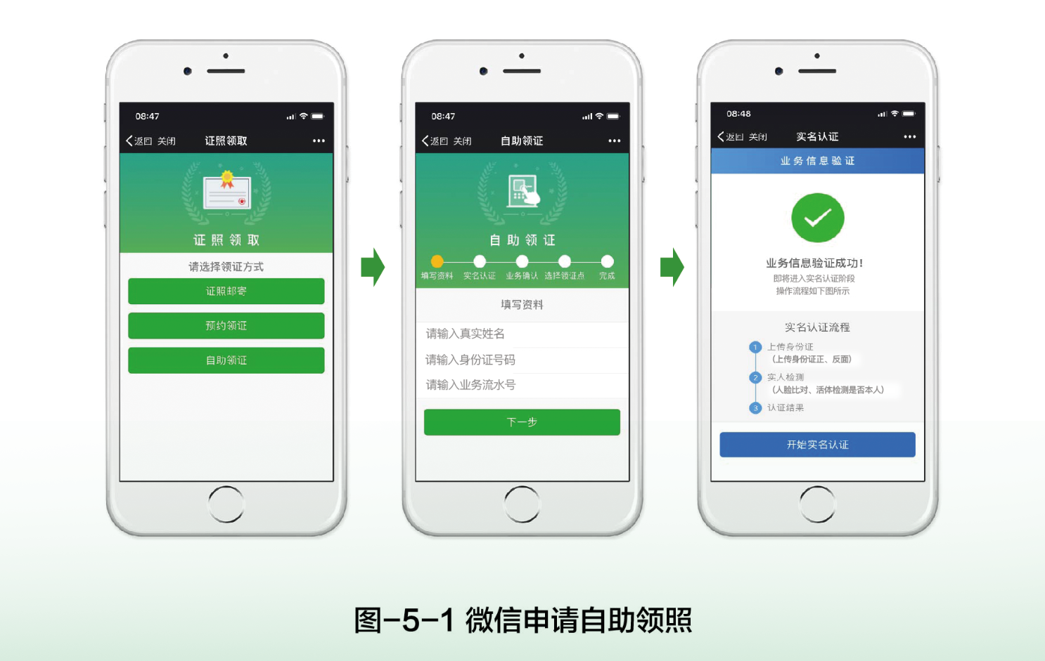 有權(quán)領(lǐng)照人通過(guò)微信端申請(qǐng)系統(tǒng)完成自助領(lǐng)照申請(qǐng),系統(tǒng)界面如圖-5-1至圖-5-4所示。申請(qǐng)時(shí)需在系統(tǒng)中完成業(yè)務(wù)信息驗(yàn)證、實(shí)名認(rèn)證、照面信息確認(rèn)和自助領(lǐng)照點(diǎn)的選擇,申請(qǐng)?zhí)峤怀晒?,系統(tǒng)將通過(guò)微信消息將自助領(lǐng)照點(diǎn)地址和取證碼等信息發(fā)送給申請(qǐng)人。