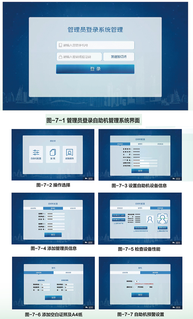 每臺(tái)自助領(lǐng)照機(jī)需要大廳配備至少—名管理人員,管理員通過(guò)個(gè)人微信登錄自助機(jī)管理系統(tǒng)完成自助機(jī)的日常管理和維護(hù)工作。自助機(jī)管理系統(tǒng)主要提供自助機(jī)網(wǎng)絡(luò)安全配置、日??瞻鬃C照和紙張管理、缺紙預(yù)警提醒、設(shè)備故障檢測(cè)等功能,設(shè)備故障時(shí)可通過(guò)該系統(tǒng)發(fā)送故障報(bào)告,求助中心技術(shù)人員維修處理,系統(tǒng)界面如圖-7-1至圖-7-7所示。